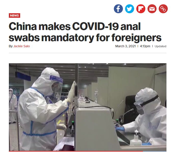 Према писању енглеског Тајмса, Кина је за све странце који улазе у земљу увела обавезу тестирања на корону узимањем аналног бриса, образлажући да је тај метод прецизнији од других.