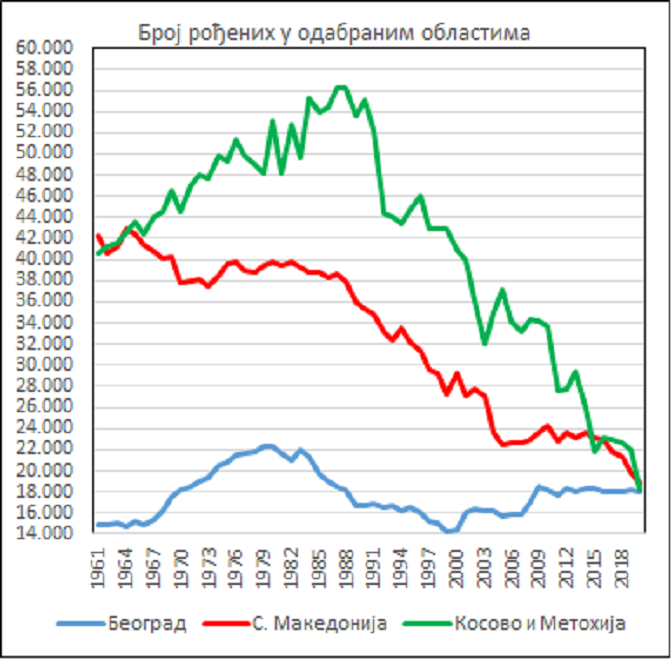 Војводина је последњи пут имала више рођене деце од Београда 2009. а Регион Шумадије и Западне Србије 2010. године. Регион Јужне и Источне Србије последњи пут је имао више рођених у 2006. и пад броја рођених је био толико оштар да је у 2019. у Београду рођено за 44,1% више беба. У Јужној и Источној Србији је давне 1961. рођено 2,13 пута више беба него у Београду (31.763:14.900).