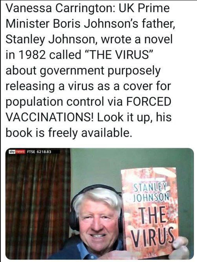 Ванеса Карингтон: Отац Предсједника владе Уједињеног краљевства, Стенли Џонсон, написао је 1982. роман под називом Вирус, у ком власти намјерно пуштају вирус као изговор за контролу становништва помоћу присилне вакцинације.