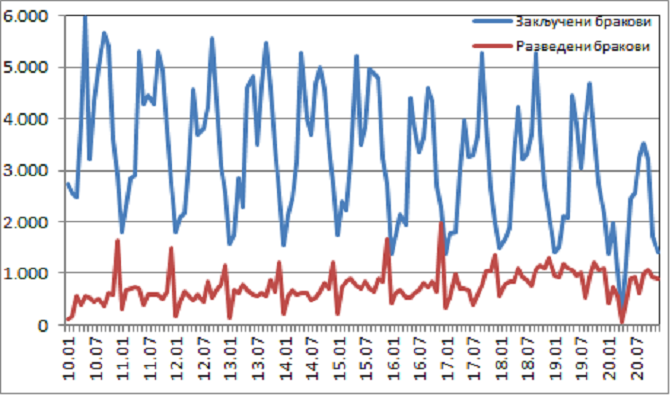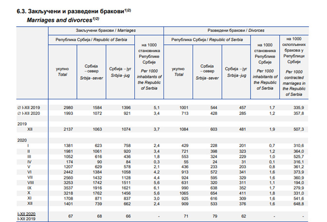 У 2020. укупно закључено 23.914 бракова што је за 11.840 бракова мање него у 2019. (35.754), и представља смањење за 33,1%. Разведено укупно 8.551 бракова, мање за 3.462 или за 28,8%