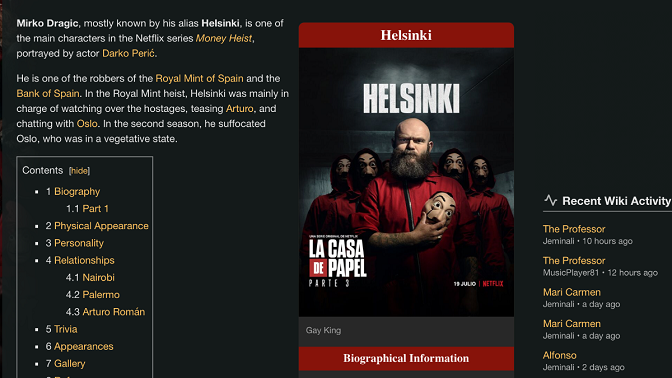 Главни лик ове серије, према писању портала за обожаваоце ове серије је Мирко Драгић, који се појављује и под псеудонимом Хелсинки. Рођен је у Србији. Био је војник у ратовима у бившој СФРЈ, заједно са својим кумом Ослом. Кажу, у Србији има породицу којој шаље новац кад може.