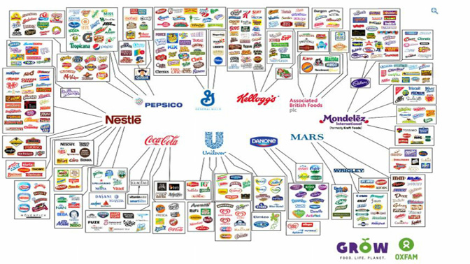 Компаније: „Нестле“, „Пепсико“, „Кока-кола“, „Унилевер“, „Даноне“, „Џенерал милс“, Келогс“, Марс“, „Асошијетед Бритиш фудс“ и „Монделез“ – свака запошљава хиљаде радника и зарађује више милијарди на годишњем нивоу.