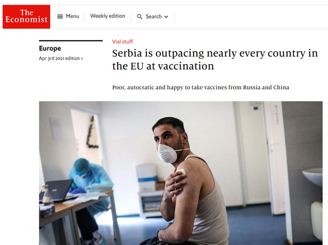 Економист наводи да је Србија по спровођењу вакцинације међу најбржима у свету, а по укупном броју датих доза трећа у Европи и да су по бесплатне вакцине у Србију дошле и хиљаде Босанаца, Македонаца и Црногораца.