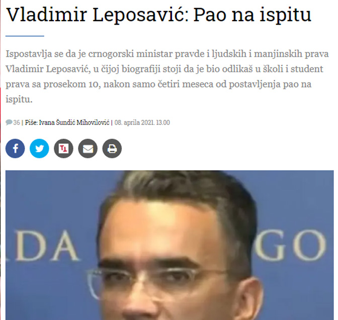 Испоставља се да је црногорски министар правде и људских и мањинских права Владимир Лепосавић, у чијој биографији стоји да је био одликаш у школи и студент права са просеком 10, након само четири месеца од постављења пао на испиту.