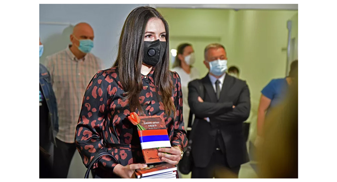 Ћерка преминулог доктора Миодрага Лазића Нина Вујошевић на откривању спомен-плоче у част њеног оца, радника УКЦ Ниш и дугогодишњег директора Ургентног центра (Фото: Спутњик/Димитрије Николић)