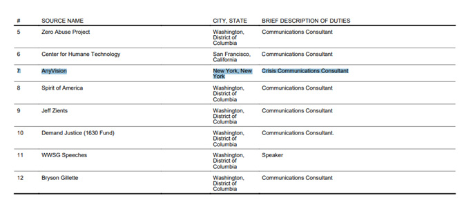 Финансијски извјештаји Псакијеве показују да је зарадила бар пет хиљада долара као консултант за фирму Енивижн (AnyVision).