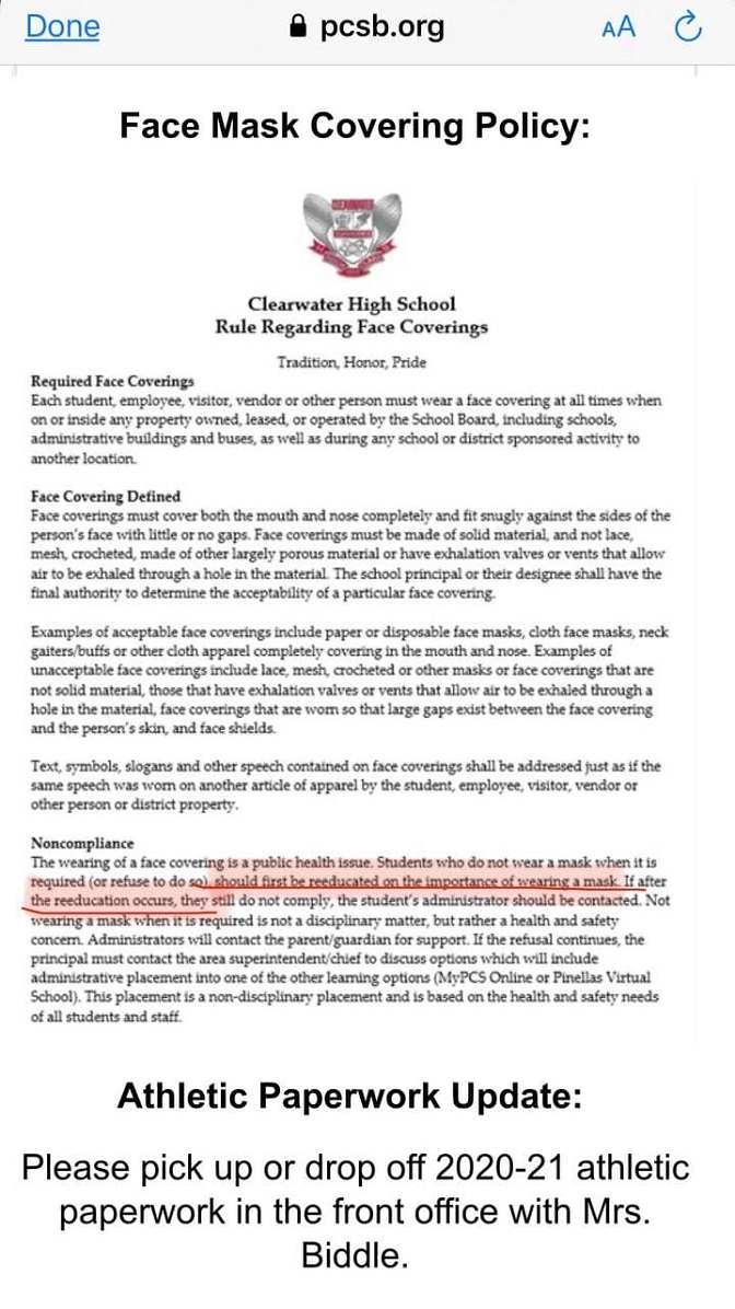 Ученици средње школе у Клирвотеру на Флориди (САД) упозорени су да ће ићи на „преваспитавање“ о важности ношења маске буду ли на простору школе виђени без ње.