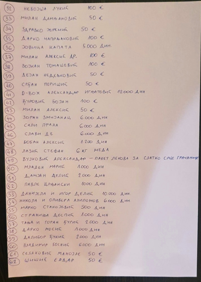 Од тога је 130 евра прилог Миленка Спасојевића из Швајцарске, а бојлер и 70 евра прилог Ненада Јеремића и његових пријатеља.[2]