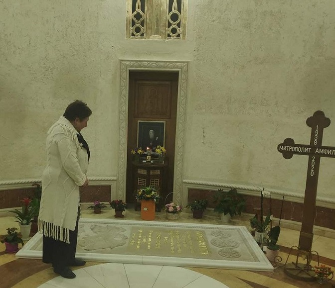 Бранка Милић крај гроба блаженопочившег митрополита Амфилохија (Фото: ИН4С)