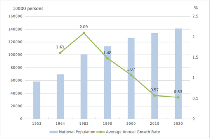 У односу на 1.339.724.852 приликом шестог пописа из 2010. број становника је повећан за 72.053.872, или за 5,38%. Просечан годишњи раст био је 0,53%. Кина је повећала за 10 година број становника за више од 10 Србија без истргнутих становника Косова и Метохије, али је погледом на графикон лако претпоставити да се ради о остарелим Кинезима јер је ово најспорији раст од првог пописа 1953.