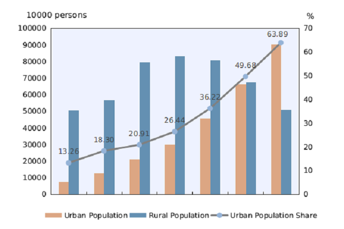 У урбаним подручјима живело је 901.991.162 учествујући са 63,89% и 509.787.562 у руралним подручјима са уделом од 36,11%. У односу на шести попис урбано становништво је повећано за 236.415.856 док је рурално смањено за 164.361.984. Удео урбаног становништва повећан је за 14,21 пп.