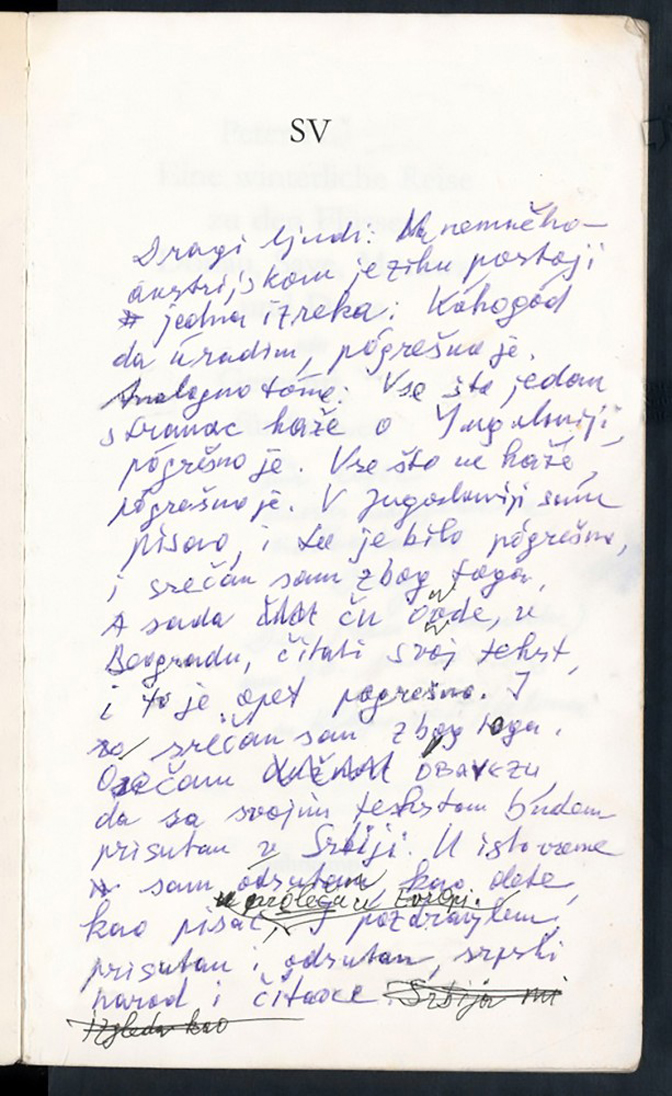 Из Хандкеове бележнице: скица за говор у ЈДП-у у Београду, где је Хандке 1996. читао Зимско путовање (Извор: РТС)