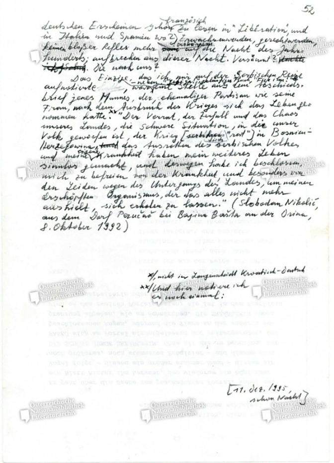 И даље сам мислио тако, тамо крај новембарске Дрине, a мислим и сада овде поред једног исто тако зимског, али тихог шумског рибњака изнад кога управо тутње десетине хеликоптера ca државницима из разних земаља, на путу од војног аеродрома Вилакублеј ради потписивања мировног уговора у Паризу 14. децембра 1995: да ли је тако механичко просипање речи међу народе наследно, па макар то касније генерације прећуткивале, као што сам то и ja, у односу на Србе, доживео код мојих Аустријанаца, с једне стране као оно старо, против убице империје уперено „Србија мора умрети!“ (Serbien muß sterbien), с друге стране као ново, љубазно-потцењивачко, упућено алпским Словенцима: „Само ви нама дођите!“? Да ли су људи који реагују тако бесно и слепо икада били у стању да створе и одрже мир? He, мир је настајао само овако: пустите да мртви покопају своје мртве. Пустите да југословенски мртви покопају своје мртве, a да живи опет нађу пут до живих. (…)