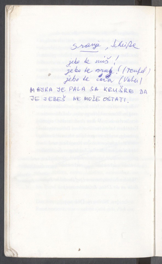 Једино што сам забележио на свом српском путовању било је – поред „Јебига!“, уобичајене псовке – једно место из опроштајног писма оног човека, који je, бивши партизан као и његова жена, након избијања босанског рата себи одузео живот. И овде га бележим још једанпут, у заједничком преводу Жарка Радаковића и Златка Боцокића, алиас Адријана Брауера: