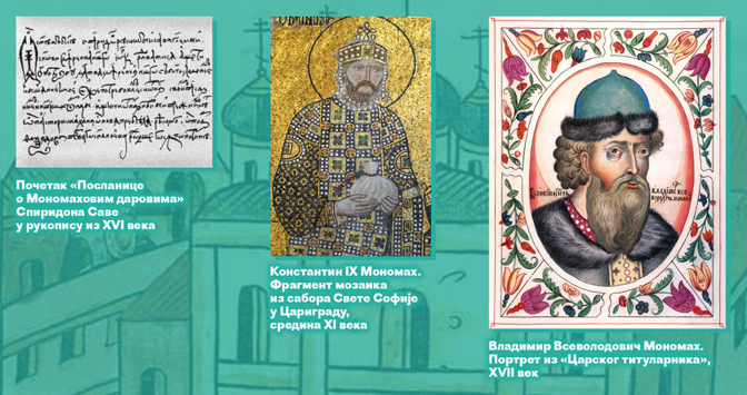 Спиридон Сава, аутор „Посланице о Мономаховим даровима“ (око 1503. године) приписује Константину Мономаху, цару из XI века, следеће опроштајне речи упућене унуку, руском кнезу Владимиру Мономаху: „Нека се не побуне Цркве Божије и нека цело Православље буде у миру под влашћу нашег царства и твог слободног самодржавља у Великој Русији. Нека те од сада почну називати боговенчаним царом, којег је овом царском круном крунисала рука најсветијег митрополита Неофита и епископи“.