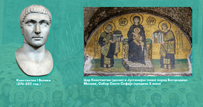 Године 324. Константин Велики, први хришћански цар, ујединио је Запад и Исток под своју власт. Скоро одмах започиње изградњу нове престонице Римског царства – Цариграда, Новог Рима. Требало је да преузме штафету старог Рима у погледу светског политичког центра. Од тада је царство постало хришћанско, а његови владари су сматрали себе само земаљским намесницима Небеског Цара. У сакралној сфери држава је уступила место Цркви Христовој, чији су поглавари у локалним местима формирали хијерархију на челу са пет најмеродавнијих епископа – „васељенских патријарха“.