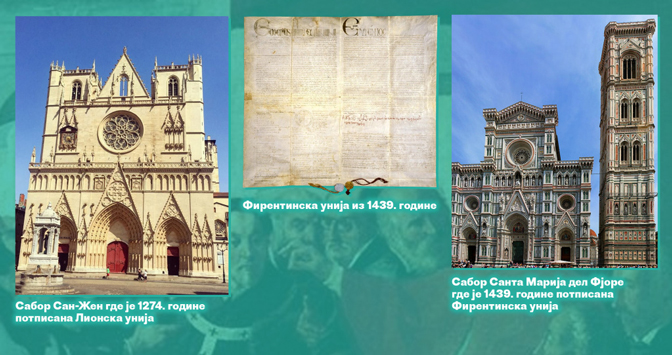 У очајничкој нади да сачувају државу, византијски цареви и црквени политичари су два пута одлучили да се поклоне Западу, прихватајући услове Лионске (1274) и Фирентинске (1439) уније које је диктирао Рим. Али ни у једном случају ови црквени компромиси не само да нису донели очекиване спољнополитичке дивиденде, него су изазвали снажан протест у земљи. Ево како византијски историчар Дука описује резултате Фирентинске уније: