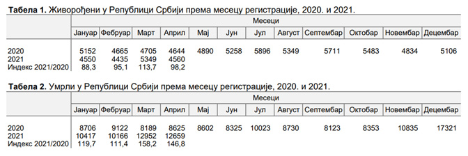 Број умрлих у Републици Србији у периоду јануар-април 2021. године износио је 46 194 и, у односу на исти период претходне године, када је број умрлих био 34 642, бележи се раст од 11 552 или за 33,3%.