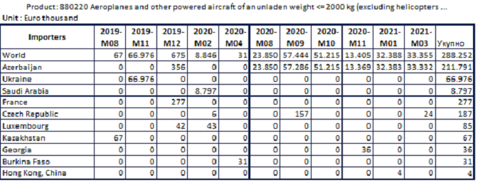 У јануару и марту 2021. Турска је продала ових летелица Азербејџану у сличној вредности (39,4 и 39,7 милиона долара) и количини (30,3 и 33,1 тона).