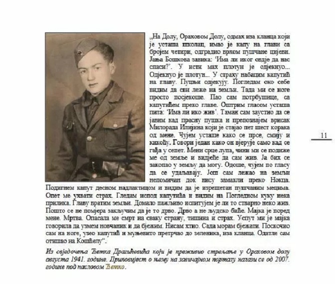„Тамо ћете наћи изјаву Ћетка Драгићевића који је био на стрељању и остао жив. Он објашњава како се то десило, кад су одјекнули ти пуцњи, зашто је и како он пао и како се дигао с тог места злочина. У Пребиловцима је рођен и живео је до своје 12 године академик Екмечић. У књизи има и фрагмената његовог говора који је одржао у Пребиловцима када су отворене херцеговачке јаме и кад се из јаме у Шурманцима народ вратио у Пребиловце са својим посмртним остацима. Има ту и изјава Павла Булута, који је данас једини у животу, а био је савременик тих догађаја из 1941. године“, предочава за Спутњик један од аутора књиге и уредник и оснивач портала „Пребиловци — село на интернету“ Ацо Драгићевић.