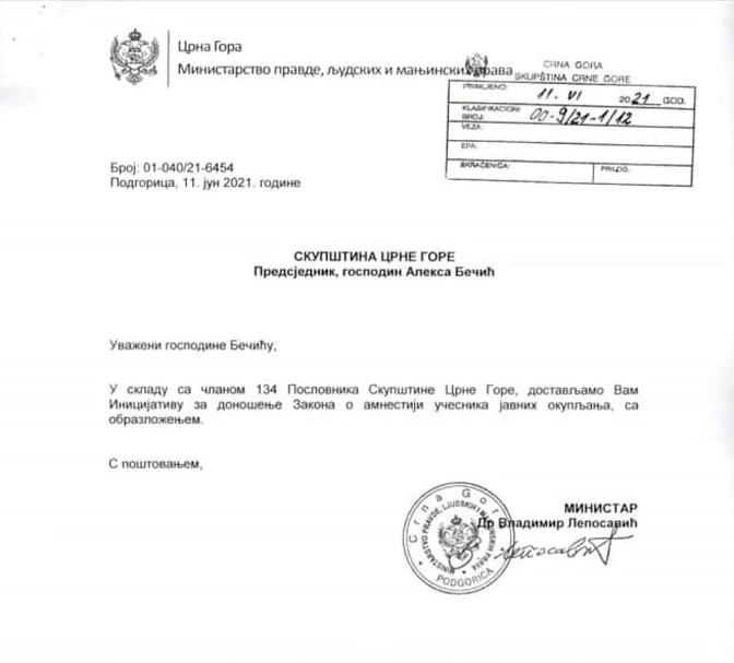 Министар правде, људских и мањинских права др Владимир Лепосавић поднио је Иницијативу предсједнику Скупштине Црне Горе Алекси Бечићу за доношење Закона о амнестији учесника јавних окупљања.