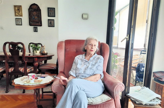 Има 91 годину, преживела је корону, пуши пола паклице цигарета дневно и доручкује банане и лимун, уз обавезну јутарњу кафу. Доручак је заиста укусан. Нуди ми још једну порцију, тврди да је одлично за имунитет. Неодољиво подсећа на славну британску глумицу Хелен Мирен.