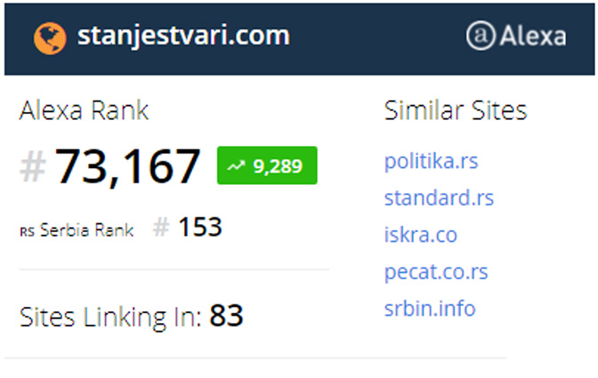 За разлику од пада помоћи, Стање ствари је напредовало на листи најпосећенијих сајтова у Србији по рангирању система „Alexa“ (тренутно смо 153, прошлог месеца смо били на 189. месту).
