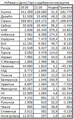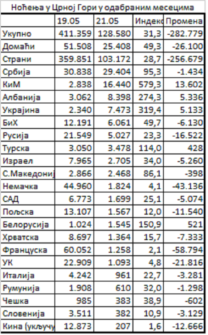 Код страних ноћења највише их је забележено из Србије без КиМ (29.404), са КиМ (16.440) и из Албаније (8.398). У односу на мај 2019. број ноћења из Србије без КиМ смањен је за 4,7% док је повећан број са КиМ 5,8 пута а из Албаније 2,7 пута. Из Русије је забележено 23,3% од броја ноћења у мају 2019. а главни разлог за смањење укупног броја било је само 2,1% ноћења из Француске и 4,1% из Немачке. Повећање броја ноћења регистровано је још из Украјине 3,2 пута, из Белорусије (+50,9%) и из Турске (+14%).