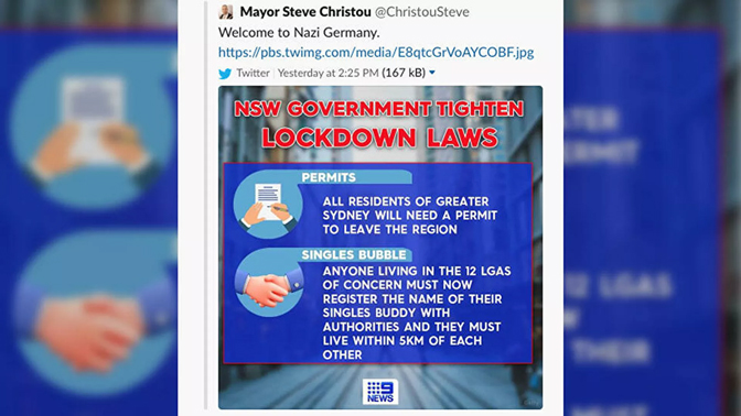 Стив Кристоу, градоначелник Камберленд Сити Кансила, једног од предграђа Сиднеја, упоредио је корона мере у тој земљи са нацистичком Немачком.