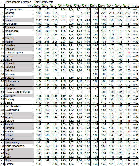 Србија је у 2019. била на 26. месту међу земљама и територијама за које Евростат прикупља податке и удаљила се од дна листе где је била у дугом временском периоду. То је последица пада стопе фертилитета у многим земљама док је у Србији дошло до незнатног раста.
