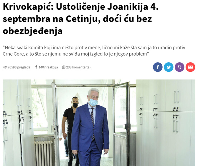 Премијер Црне Горе Здравко Кривокапић казао је да неће присуствовати устоличењу митрополита црногорско-приморског Јоаникија Мићовића на Цетињу, које је заказано за 5. септембар, рекавши да је могућа забрана тог догађаја крајња мера уколико ризици буду представљали опасност по грађане.