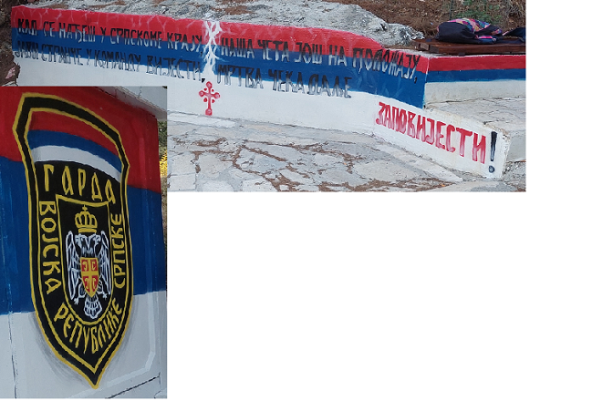Четврта слика је споменик невесињским устаницима, а то ме је подсетило на Цетиње (Подгорица) и Требиње (Дубровник) као српски отпор Турцима и католицима и њиховом насиљу. Љубиње сам додао због усташке Чапљине а Дедиње ми је једино пало напамет уз ове остале „иње“. Милошев конак се налази на Топчидеру како би могло да се побегне на Дедиње у случају турског напада.