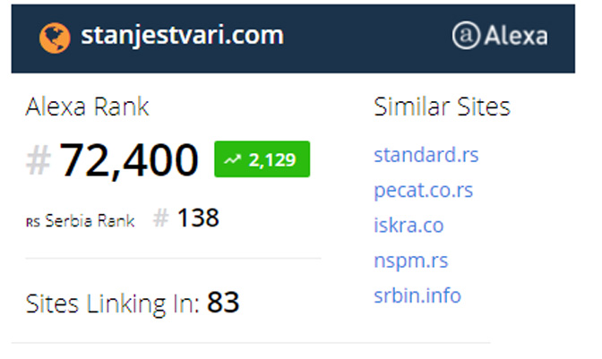Захваљујући и вашој помоћи Стање ствари се нашло у првих 140 сајтова у Србији по рангирању система „Alexa“ (тренутно смо на 138. месту).