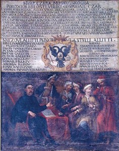 Марко Мартиновић, у доба Петра Великог, у Перасту, подучава поморским вјештинама седамнаест кнежевских синова из Москве, 1698. године. (Фото: Музеј града Пераста)