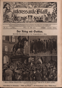 ‘Патриотске’, про-ратне, демонстрације испред бечког Министарства рата, јул 1914. Наслов бележи ‘Рат са Србијом’ (Фото: 1914-1918. Online)