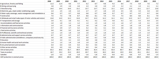 Највеће уделе у БДП-у у 2020. имале су прерађивачка индустрија (13,8%), трговина (12,6%), грађевинарство (7,9%) и пословање са некретнинама (7,4%).