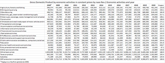 У константним ценама БДП КиМ повећан је за 88,8% у 2020. у односу на 2008. Смањен је само у делатности уметности и забаве, а повећан је више од три пута у: здравству (3,47), јавној управи (3,35), електричној енергији (3,17) и услугама смештаја и исхране (тачно три пута).