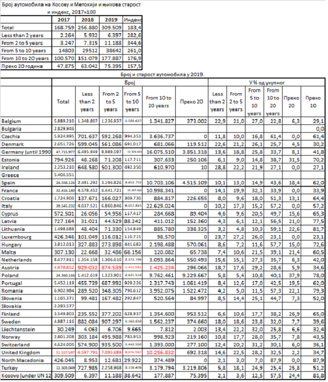 Евростат је издао саопштење (линк) о броју путничких аутомобила по становнику и њиховој просечној старости по чланицама ЕУ. За неокупирани део Србије нема података, али за Косово и Метохију има, па је ред видети какви су.
