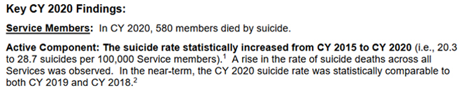 „Налази су забрињавајући. Стопа самоубистава међу припадницима Министарства и породицама војника и даље је превисока, и не крећемо се у добром смијеру“, каже се у изјави министра одбране Лојда Остина.