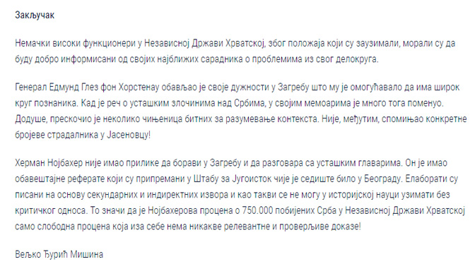 Закључак текста В. Ђурића Мишине „Немачки официри о броју жртава у Јасеновцу„