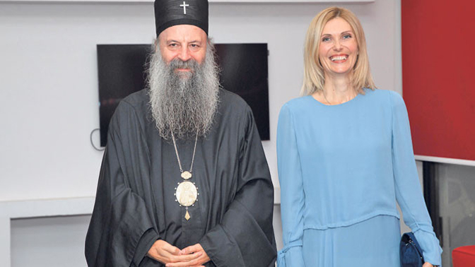 Патријарх Порфирије и Јелена Поповић уочи премијере филма у „Комбанк дворани” (Фото: Марко Спасојевић)