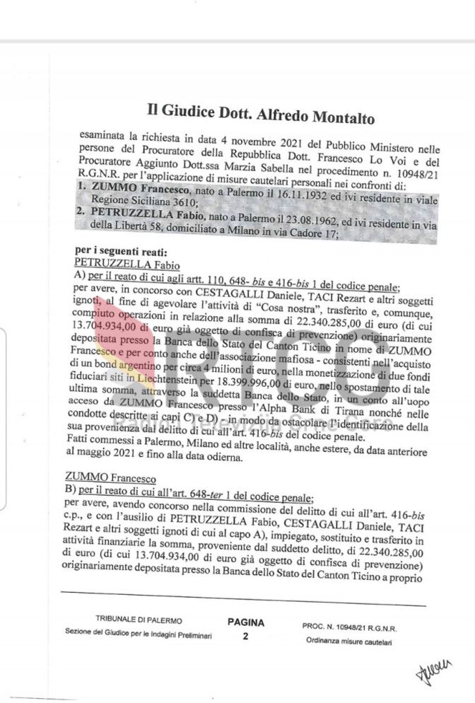 Извештај о истражним радњама суда у Палерму садржи транскрипт разговора Резарта Тачија и осумњиченог италијанског држављанина Данијелеа Кестагаљија у коме Тачи помиње Ђукановића у контексту интервенције да би се преко „председничке банке” из Црне Горе обавила међународна исплата.