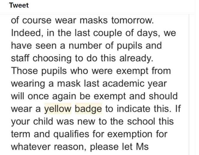 See below. Email from the school. Children must wear a Yellow Badge to prove they’re mask-exempt.