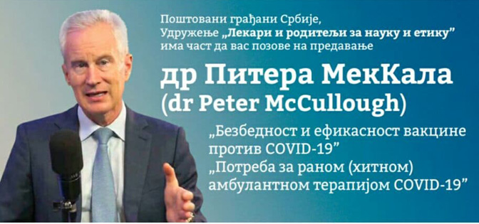 Удружење „Лекари и родитељи за науку и етику” организује трибину и предавање др Питера МекKала (dr Peter McCullough) уживо преко видео везе, са темом: „Безбедност и ефикасност вакцине против COVID-19“ и „Потреба за раном (хитном) амбулантном терапијом COVID-19“.