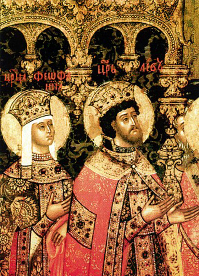 Православни цар је такође традиционално приказиван с ореолом – како на иконама, тако и на верским сликама. Тај ореол, међутим, није знак да је овај или онај цар прослављен као светац. Та иконографска традиција пре сведочи о томе како Црква традиционално види свети и божанствени карактер царске власти. На икони Покрова Пресвете Богородице доле лево приказана је Света царица Теофанија која је блажено преминула 10. новембра 897. године (сећање на њу се обележава 16/29. децембра). Међутим, Цар који је приказан крај ње, њен супруг Лав VI Мудри (886–912), није прослављен, али су ипак обоје приказани с ореолима.