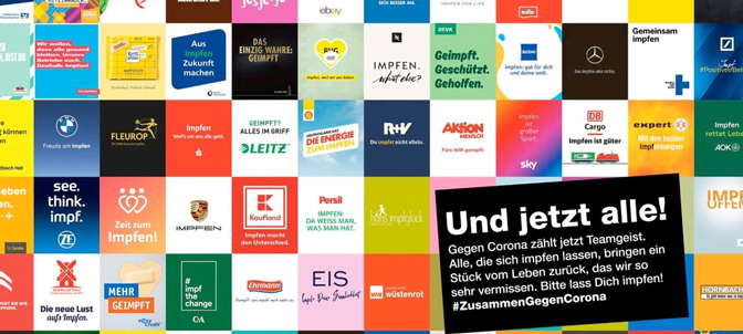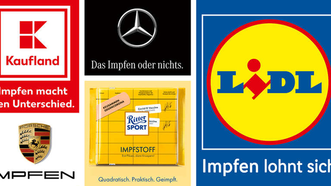 То је резултирало веома смешним рекламним слоганима као што су „Вреди се вакцинисати“ (Lidl), „Поштуј онога ко се вакцинише“ (Toom), „Дођи да се вакцинишеш и сазнај“ (Douglas), „Дај вакцинишите се!“ (Netto), „Радост у вакцинацији“ (БМВ), „Вакцинација: Знаш шта имаш“ (Персил), „Вакцинација је сјајан спорт“ (Ски), „Можеш да градиш на темељима ове вакцинацији“ (Bausparkasse Schvabisch Hall) или „Вакцинирај, волим то“ (McDonald’s).