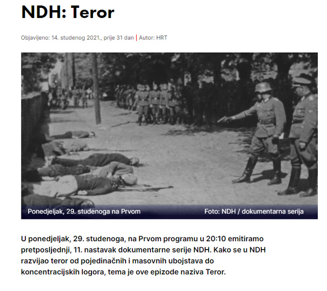 Када се погледа ова епизода јасно се може видети да неко ко нема увид у националну припадност протераних и ликвидираних цивилних жртава не може да стекне праву слику да се радило о геноциду који је спроведен од стране усташких власти над српским народом. Он се у тумачењу хрватских историчара у овој серији не означава као геноцид почињен над српским народом што јасно говори и сам наслов ове епизоде у серији – Терор. Само је један историчар из Немачке у свом излагању говорио о геноциду, остали учесници у овој серији као да су се држали прећутног договора да се говори о терору и прогону а да се велико и ужасно страдање српског народа не квалификује као геноцид. У неколико наврата у серији се истицала улога надбискупа А. Степинца као брижног заштитника Жидова, а навођена је и његова изузетна „забринутост „због покрштавања и злочина почињених над православним становништвом. Та дозирана врста перфидног прикривања стварног карактера усташког покрета и пара квислиншке НДХ-а има у себи јасно одређену дозу приказаних утврђених чињеница које неће нарушити потребну прихватљивост ове серије у хрватској јавности. Тачно је одређена мера и досег ове серије, а она се може видети у њеној последњој епизоди објављеној под насловом Епилог и у речима историчара Вишеслава Аралице, боље речи његовог малог „трактата“ о срамоти и неопходности освете у правом тренутку. Просто је невероватно да је угледни историчар Хрвоје дозволио себи да у овој серији објави следеће ставове В. Аралице. “НДХ-а је прва национална држава Хрвата. Она доста јесте била држава и била је национална хрватске држава. Међутим, кад бих је једном ријечју ишао описати и НДХ-а и све око тога, рекао бих срамота. Сад морам објаснити што је ту срамота. Јер није баш све ту срамота, у тој НДХ-а. Пођимо с осветом. Оно што запањује у НДХ- је био несразмјер осветничког чина и разлога за освету. Пример је Анте Врбан који је сам признао да је убио неких 600-ињак, односно да је суделовао у убојству 600-ињак Јевреја и да је погушио 63 дјеце. Он тврди 63, други кажу више стотина српске дјеце с Козаре. То је учинио, зато што се друге године након Велебитског устанка морао пријављивати жандарима неколико ноћи заредом, трипут по ноћи, да је ето био малтретиран гадно. Ја имам разумијевања за освету. Ако су Хрвати мислили да се морају светити Србима због нечега. На примјер, због убојства посланика у београдској Скупштини, због убојства Стјепана Радића, због кундачења и понижавања, због исмијавања зато што су говорили да су Хрватску на сабљи добили. Због тога што су их тукли, малтретирали, затварали, кидали нокте, убијали људе као у Сењу или код Сибиња. Ако они мисле да се треба осветити, онда је то у реду. Међутим, освета, ако је права, мора услиједити одмах након чина. Али оно што су Хрвати у ствари радили, показали су да нису особито вољни за стварање своје државе. Они су морали чекати и били су лојални грађани те државе, слали су своја посланства Карађорђевићима на двор, клањали им се и лупали печате у својим канцеларијама до Симовићевог пуча, док нису дошли Нијемци. Е то је ружно. Кад Нијемци долазе. Нијемци руше ту српску државу, српску власт над Хрватима. Нијемци руше. Талијани руше. Е сад ћемо им се осветити. То је срамота. Срамота је кад се почнете освећивати на слабима. Жена и дјеца су били убијани. Срамота је такођер к