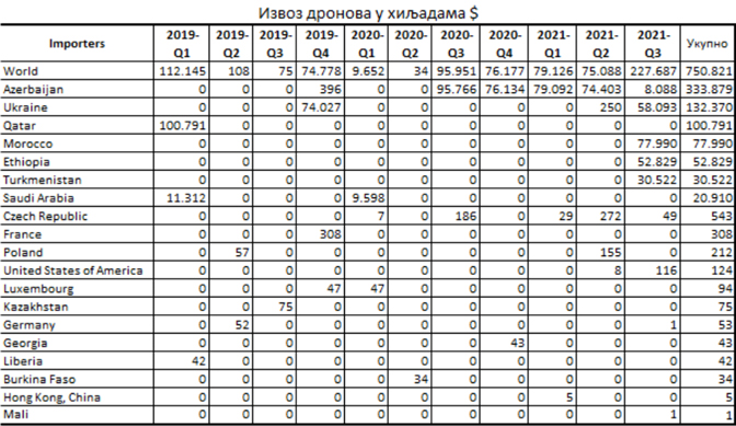 До октобра 2021. извоз дронова вредео је 750,8 милиона евра, а у томе само у Азербејџан 333,9 милиона евра.