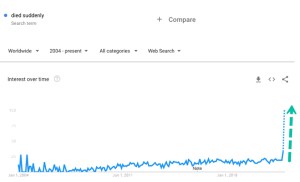 Прерано би било нагађати да ли су у питању посљедице примања ковид-19 вакцина попут запаљења срчаног мишића (Zero Hedge, 17. 11. 2021) Упало нам је у очи да један појам претраге на Гуглу биљежи стреловит пораст. Појам „изненада умро“ (died … Настави са читањем Гугл: Рекордан пораст претрага по појму „изненада умро“