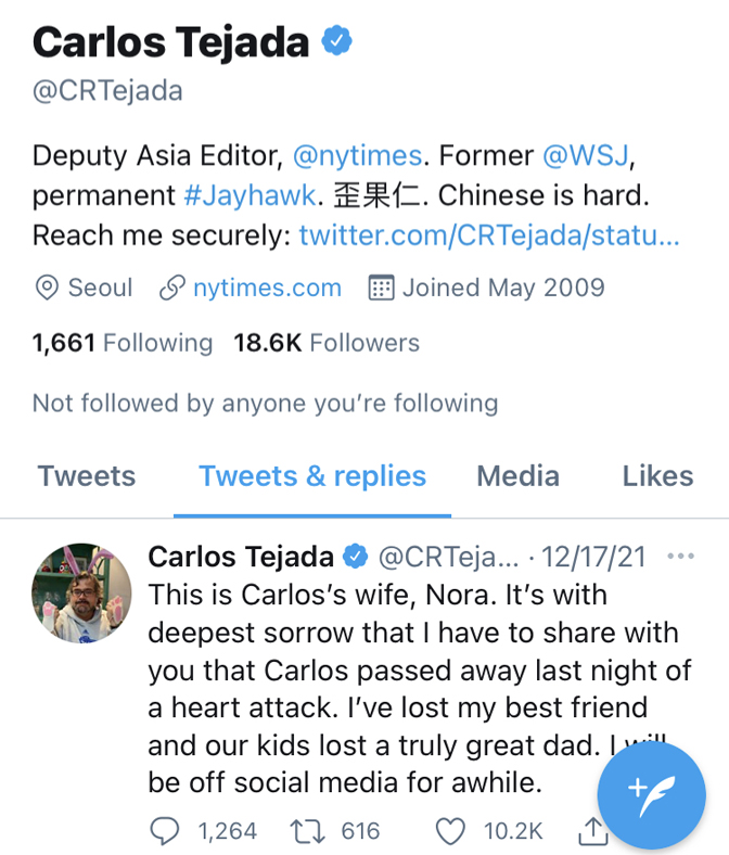 Карлос Техада био је ожењен и имао двоје дјеце. Читаву каријеру радио је у Волстрит журналу прије него је 2016. прешао у Њујорк тајмс и радио као уредник за Азију.